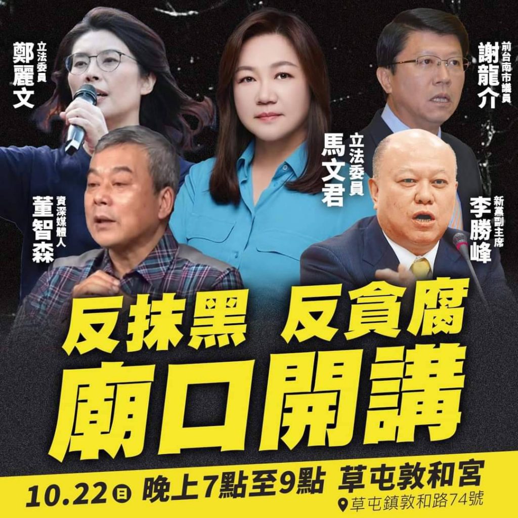 因此馬文君立委辦公室選擇在昨(22)晚,於草屯鎮敦和宮舉辦【反抹黑 反貪腐 廟口開講】,現場不只謝龍介、鄭麗文、董智森、李勝峰等名嘴助講外,草屯鎮長簡景賢、國姓鄉長邱美玲、中寮鄉長廖宜賢、南投縣議員唐曉棻、縣議員簡峻庭、縣議員李洲忠、國民黨黨部主委楊麗川、草屯埔里魚池三鄉鎮農會總幹事、草屯埔里國姓三鄉鎮婦女會,均到場力挺馬文君,並對民進黨的所作所為發出怒吼與抗議。