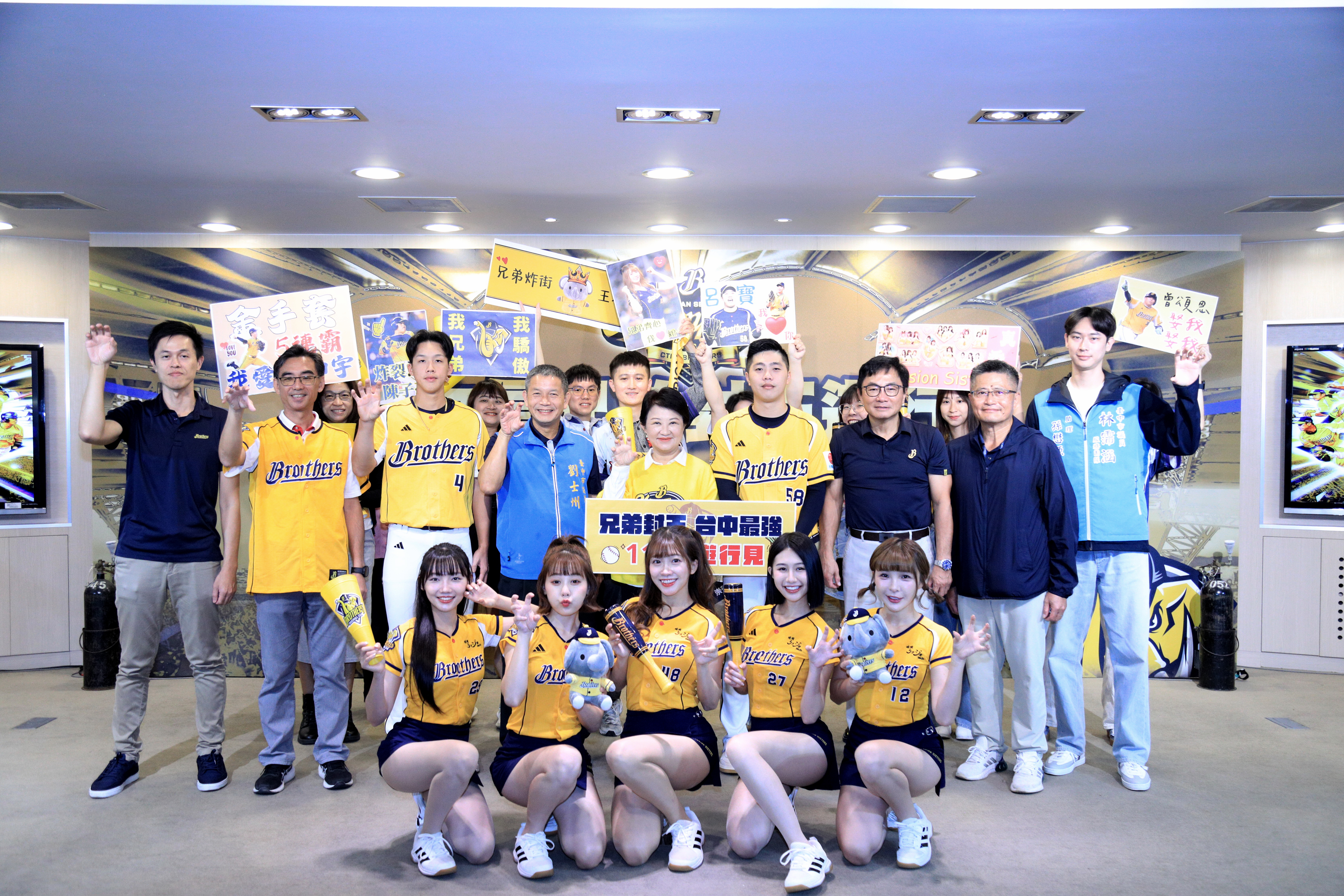 報新聞/中部特派員鄒志中報導  「百萬象迷們站出來!」、「台中就是中信兄弟的家!」「棒球」是台中的驕傲,承載球迷的光榮,去年的世界經典賽,讓世界看見台中,兄弟隊值得台中最棒的球場!為兌現「兄弟之約」!慶祝「台中地主隊」中信兄弟拿下第35屆中華職棒年度總冠軍,迎接隊史第十冠,台中市長盧秀燕2024年11月7日特別攜手中信兄弟,於市府共同舉辦盛大的「十冠傳奇:中信兄弟封王遊行感謝祭記者會」,提前為本週六(2024年11月9日)10時30分的中信兄弟封王遊行暖身。盧市長表示,中信兄弟四年間已拿下三座冠軍獎盃,她誠摯感謝所有球員和球團,凝聚了台中的力量更讓台中成為棒球驕傲的城市,他們在場上奮力拚搏,為台中再度留下冠軍榮耀,故她要兌現這份「兄弟之約」。