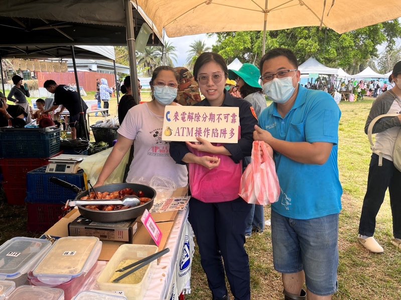 臺東警察分局寶桑派出所警員陳佳歆日前前往臺東森林公園的換樹活動進行反詐騙及交通安全宣導,透過生動活潑的方式分享案例,讓在場民眾聽得津津有味。