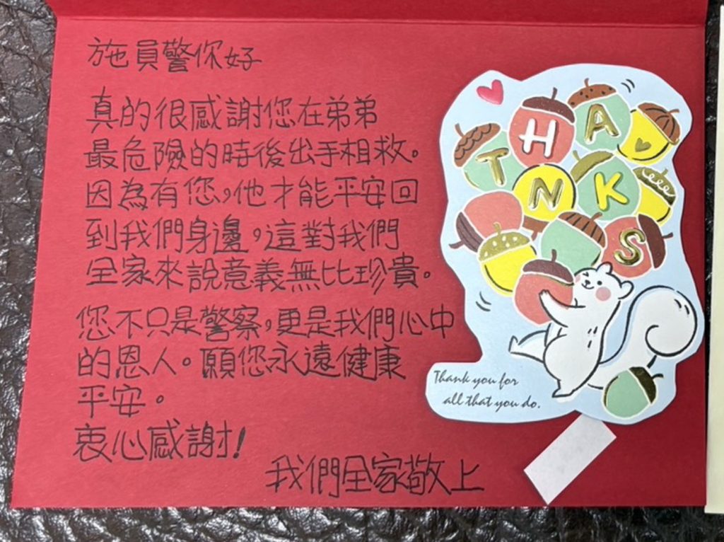 儘管身上還戴著醫療設備,體能狀況也需要時間調理,但林男及家屬沒有忘記當時出手相救的員警,特別在114年9月28日中秋節前夕,由林男的兄長陪同前往北屯派出所致送卡片及花束,表達對員警滿滿的感恩之情,員警得知林男搶救成功而且手術後狀況良好,也非常欣慰。