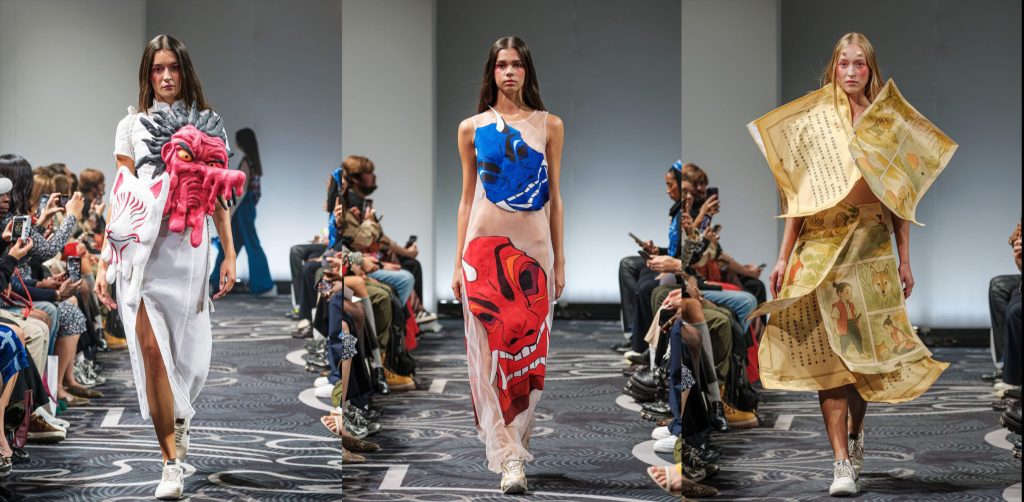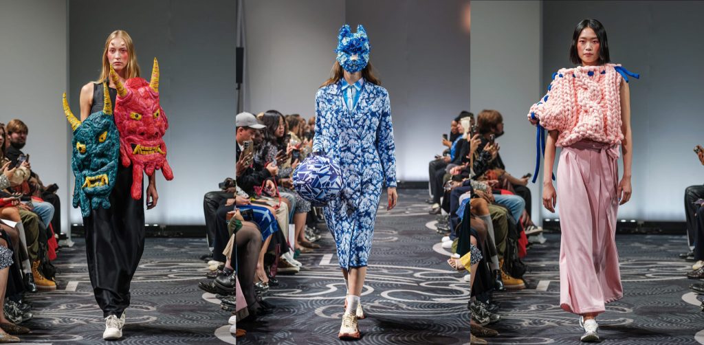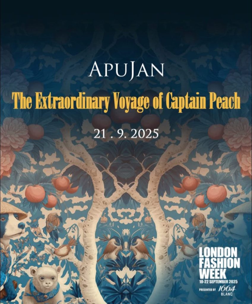 把民間故事《桃太郎》轉譯成「穿上身」的當代寓言:從巨大的紙頁服裝、鬼怪面具,到水紋針織背心與藍色鯨魚印花洋裝⋯⋯詹朴一貫「詩人式」時裝語言:浪漫與叛逆共存的「冒險」,變成一種勇氣。