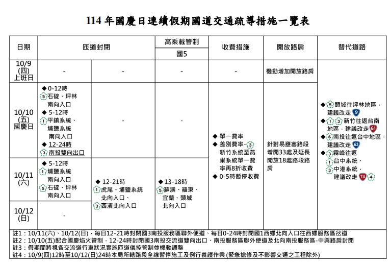 因應114年國慶日3天連續假期,苗栗縣警察局已規劃交通疏導措施,並配合交通部高速公路局實施國道3號西濱快速道路北向入口匝管制措施,請返鄉及旅遊的駕駛朋友,事先作好行程計畫,避開交通易壅塞路段。