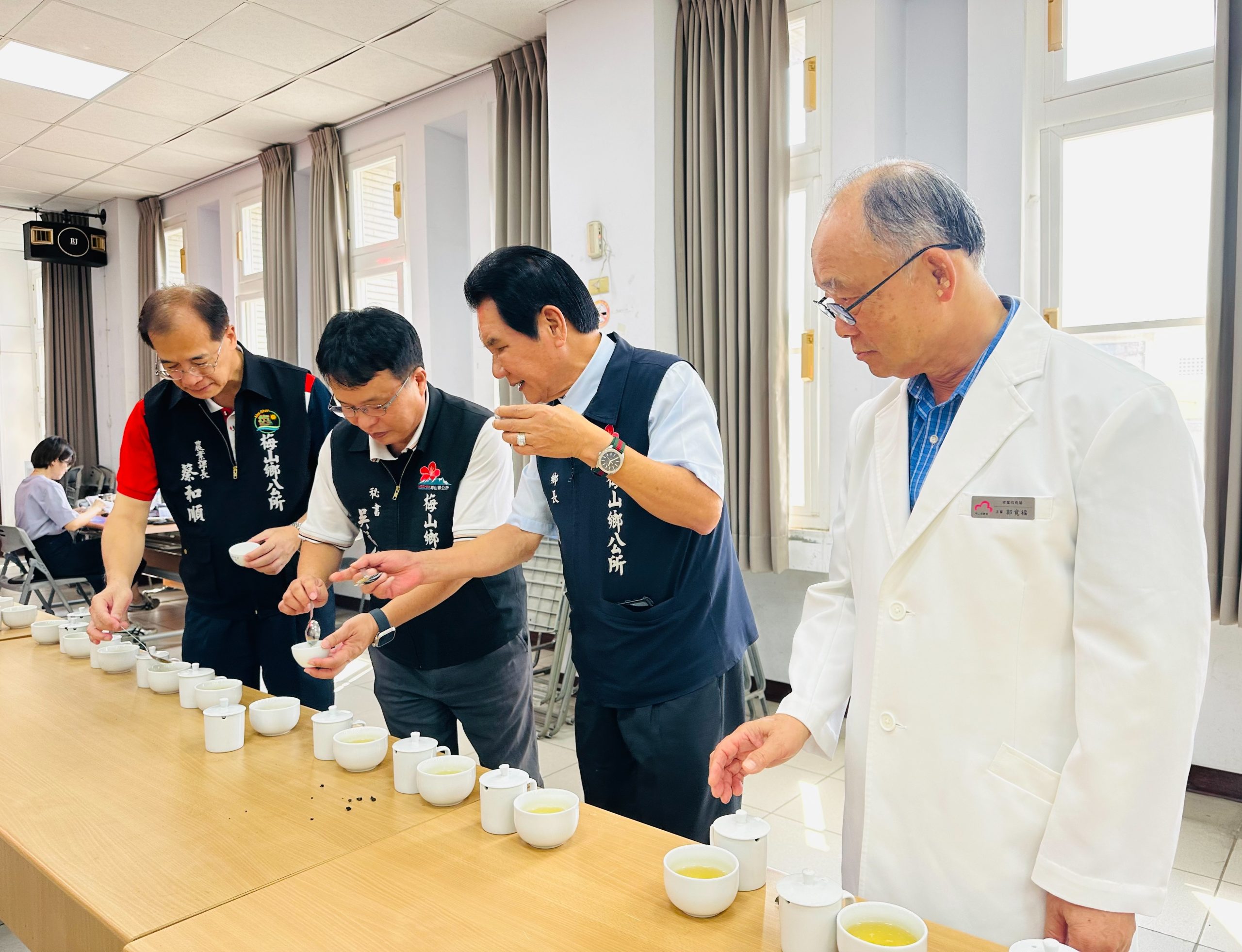 114年臺灣阿里山茶之道梅山高海拔精緻茶分級評鑑,今(12)日在梅山鄉公所三樓豋場,梅山鄉公所輔導之茶業產銷班策略聯盟計分烏龍茶組及金萱茶組競爭十分激烈,班員均提供本季寒露優良高山茶參加分級評鑑,經梅山鄉公所特別遴聘前行政院農委會茶業改良場魚池分場分場長郭寬福及農業部茶及飲料作物改良場作物改良科林金池科長嚴格評審,依茶樣之形狀、色澤、香氣、滋味評鑑,優勝者終於出爐。