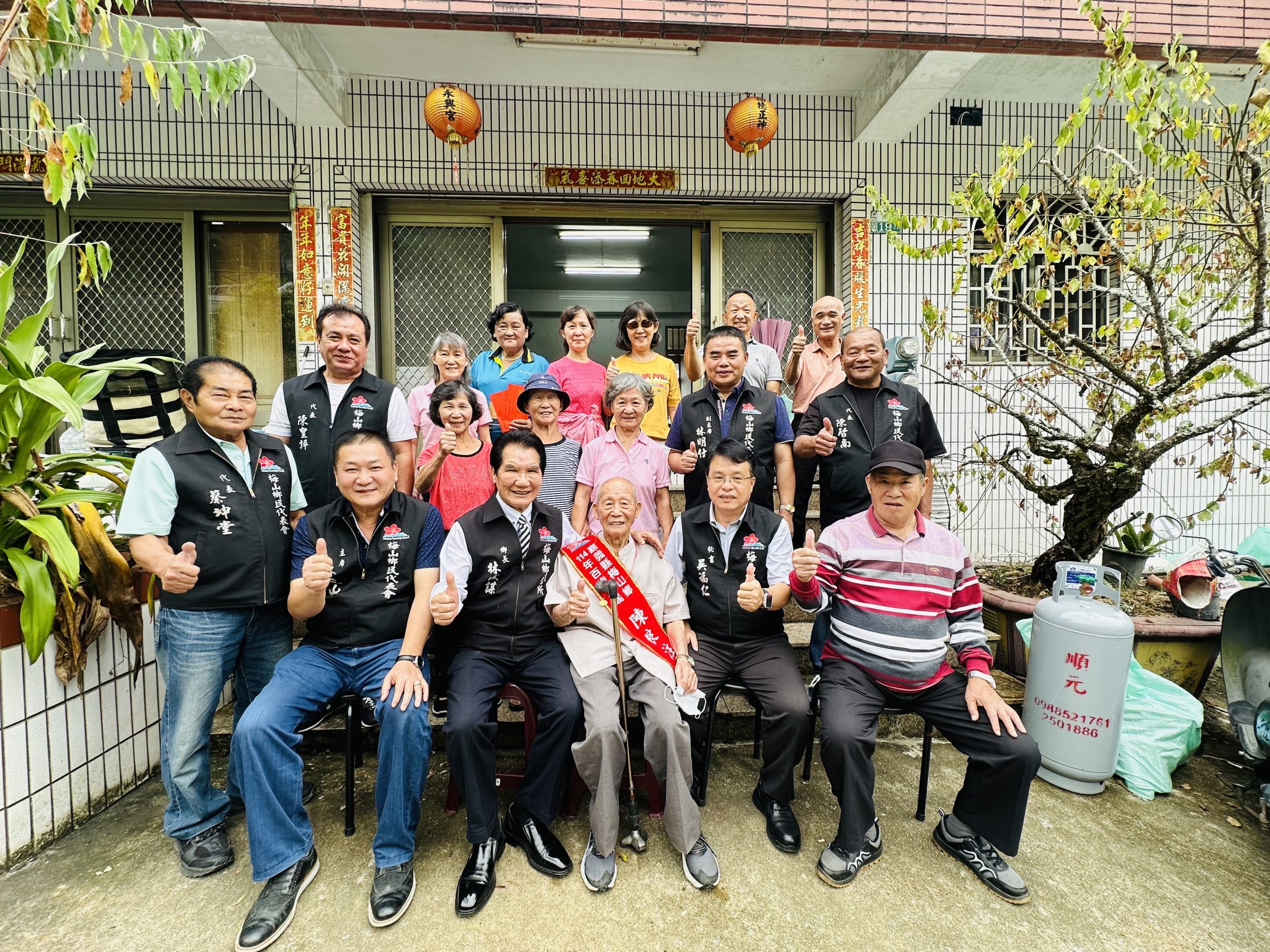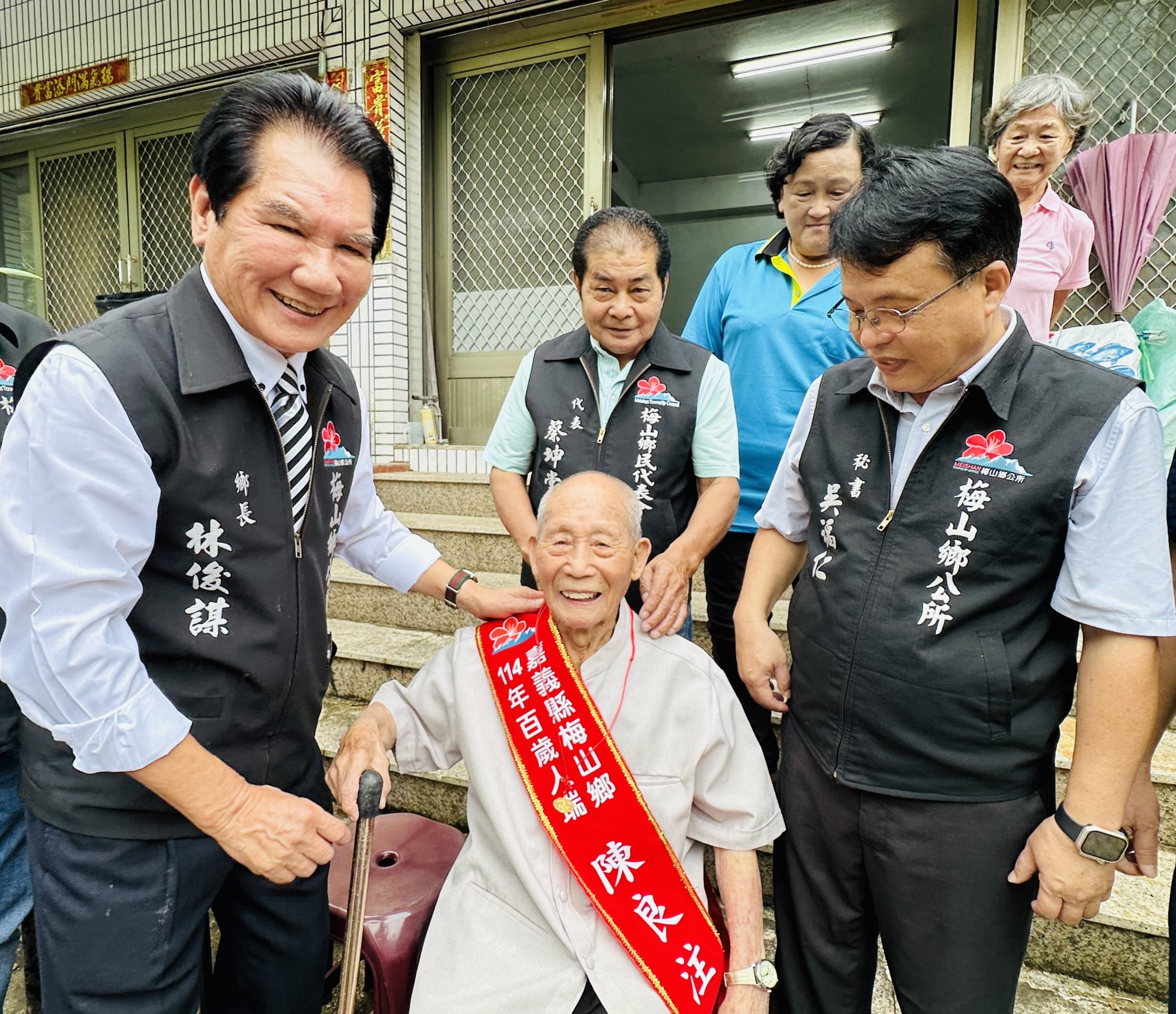 重陽節將屆,嘉義縣梅山鄉鄉長林俊謀帶領鄉公所秘書吳福仁、社會課長陳倩紅與鄉民代表會主席林茂山、副主席林明仕及各村村長等人,於10月20日及23日分別至鄉內13位人瑞家中探望百歲人瑞,並致贈總統府、衛福部、縣政府及鄉公所的紀念禮品、禮金,鄉長林俊謀一一與百歲人瑞親切問候,現場氣氛溫馨感人。