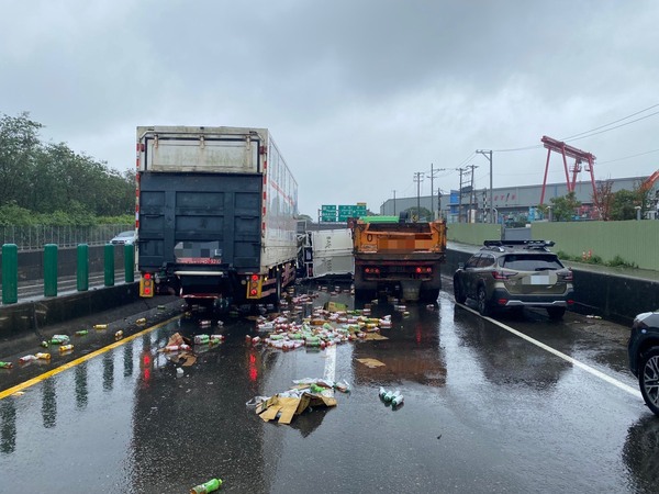 【記者葉志成/桃園報導】台66線快速公路24日中午發生一起三車連環追撞事故。一輛由王姓男子駕駛的自小客車,疑似因未保持安全車距,先追撞前方砂石車後失控翻覆,再波及同向的大貨車。事故造成王姓駕駛輕傷送醫。