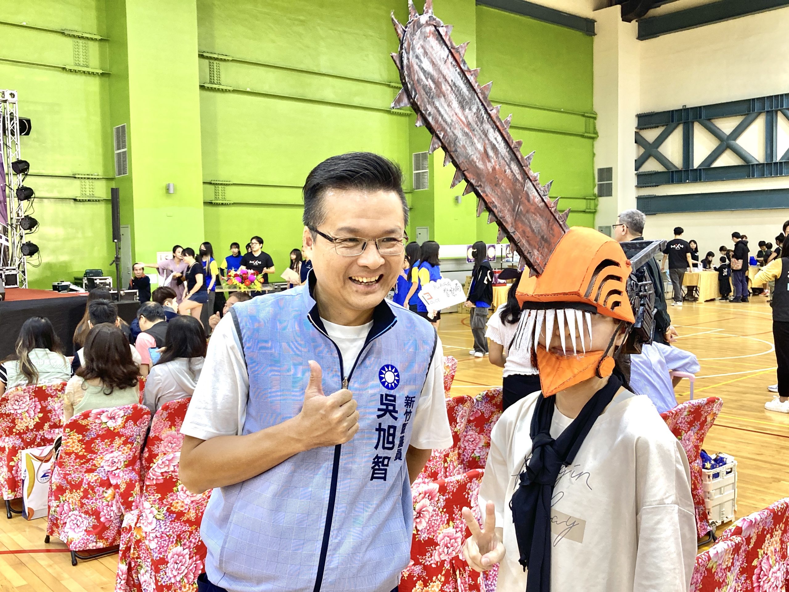 ▲竹北國民運動中心「第六屆親子公益運動嘉年華」盛大登場,竹縣議員吳旭智和變裝的民眾開心合影。