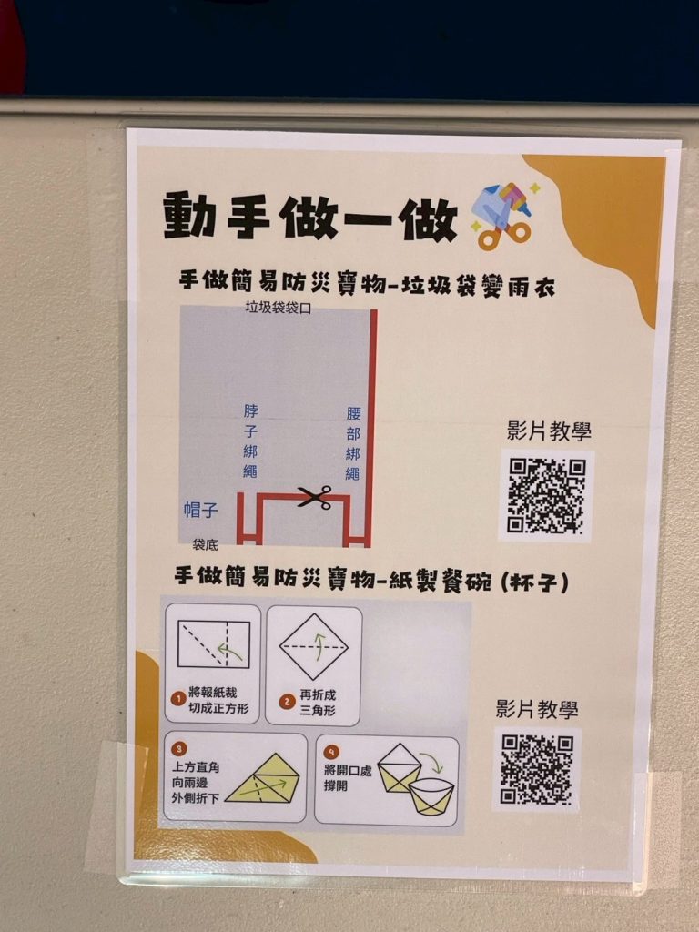 活動特別安排親子共同完成「防災用品手作」體驗,包含塑膠袋變雨衣及紙製餐具,讓家長與孩子親手製作並認識生活中可應用的防災小物,從中學習備災觀念,強化家庭防護能力。