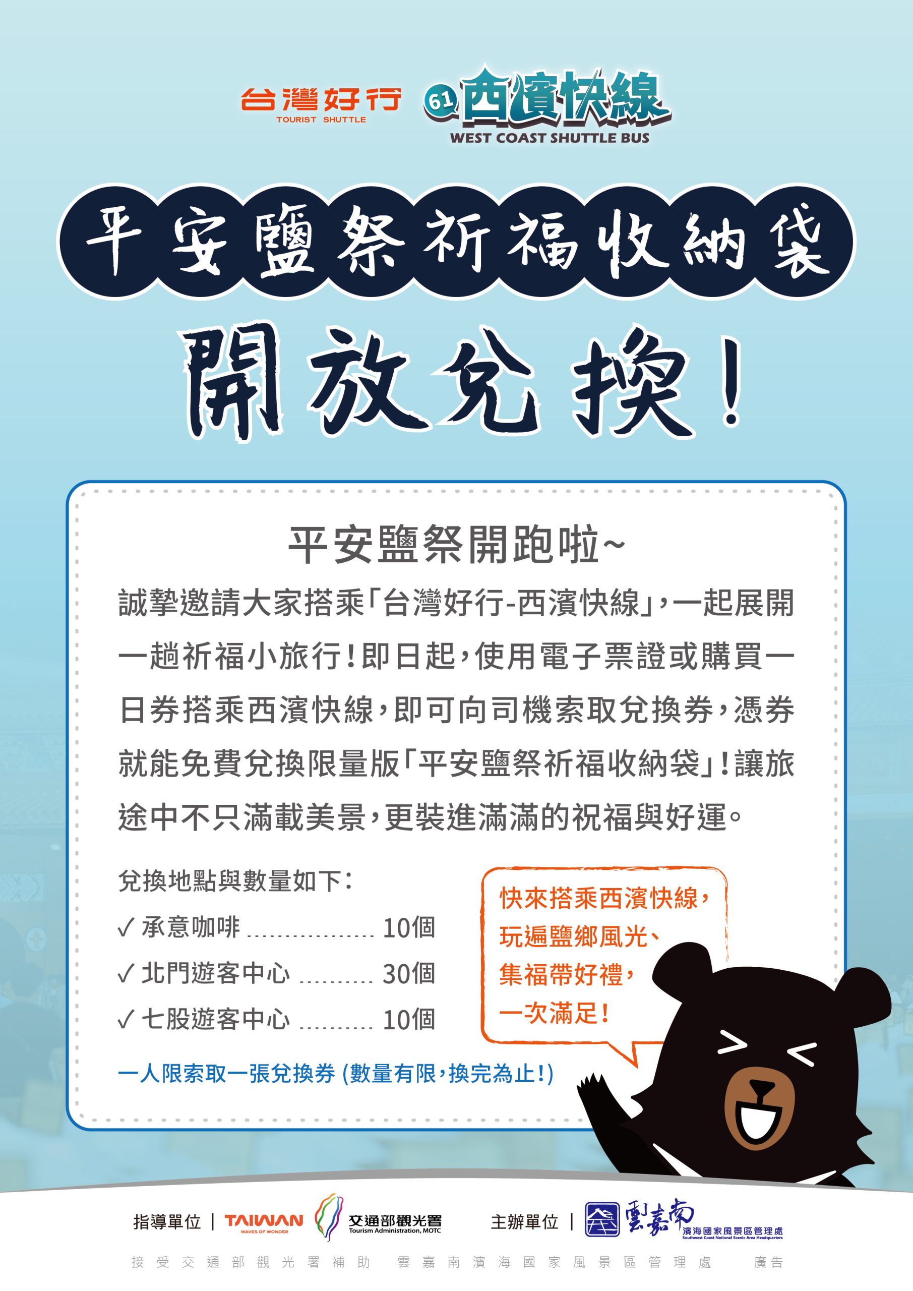 為鼓勵民眾選擇最便捷、最低碳的交通方式,「台灣好行-西濱快線」推出平安鹽祭專屬好康!這是您參與盛會、兼享獨家禮遇的最佳途徑。即日起,旅客只要使用電子票證或購買一日券搭乘西濱快線,憑向司機索取的兌換券,即可於指定地點免費兌換限量版「平安鹽祭祈福收納袋」!