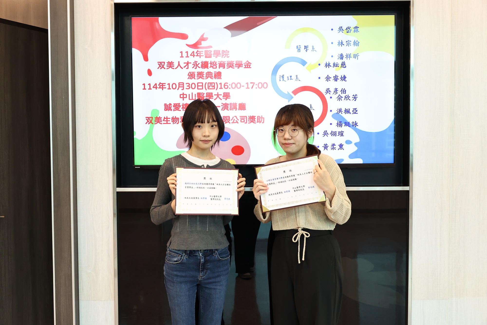 本屆獲獎學生包括醫學系、護理系、心理學系與社會工作學系等11人,其中護理系林紜慈與心理研究所黃柔熏更連續兩年獲得肯定。林紜慈曾利用獎學金赴日本目白大學進行交流,回國後更加堅定投入臨床照護的決心;黃柔熏則以研究成果赴捷克發表論文,拓展國際視野。兩人都表示,獎學金的支持讓她們能夠「專注於學習、無懼於夢想」。