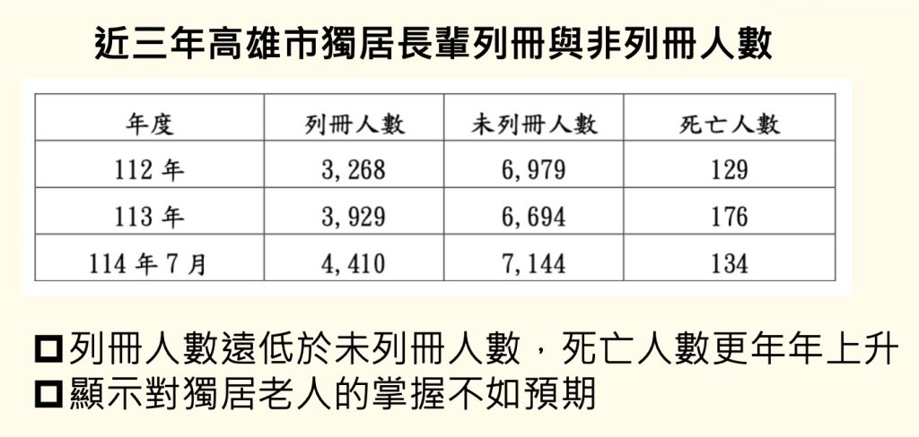 她指出,目前高雄市65歲以上獨居長者推估逾12萬人,但社會局實際列冊關懷者僅有4410人,超過九成獨居長者未被納入體系,形同社會安全網破口。若發生意外,無人通報、無人照應,恐導致孤獨死案件一再發生。她呼籲市府應強化列冊與訪視制度,更應正視制度與科技同步缺位的現況。