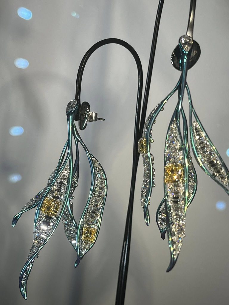 蠟雕。她始終保留帶有手工的溫度;而鈦金屬,看似未經拋光的自然金屬質感,讓光呈現出更有呼吸的弧面。每一片葉、每一根枝並非複製自然,而追求「形」的生長。