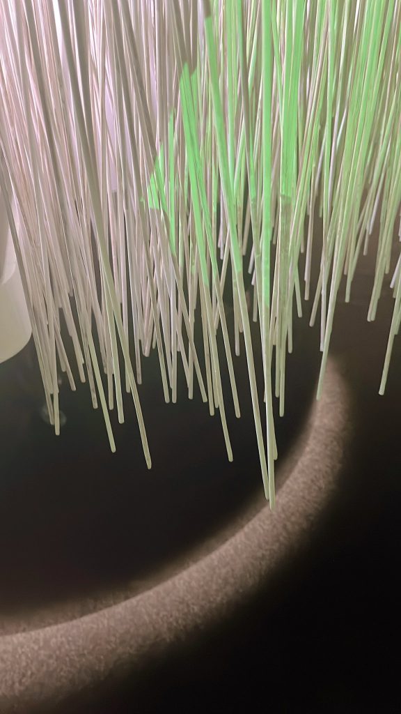 富邦美術館的展間中,作品不只是「陳列」,而是懸置在光與空氣中,站立其前,身體被光纖包圍,時間在靜止中流動。