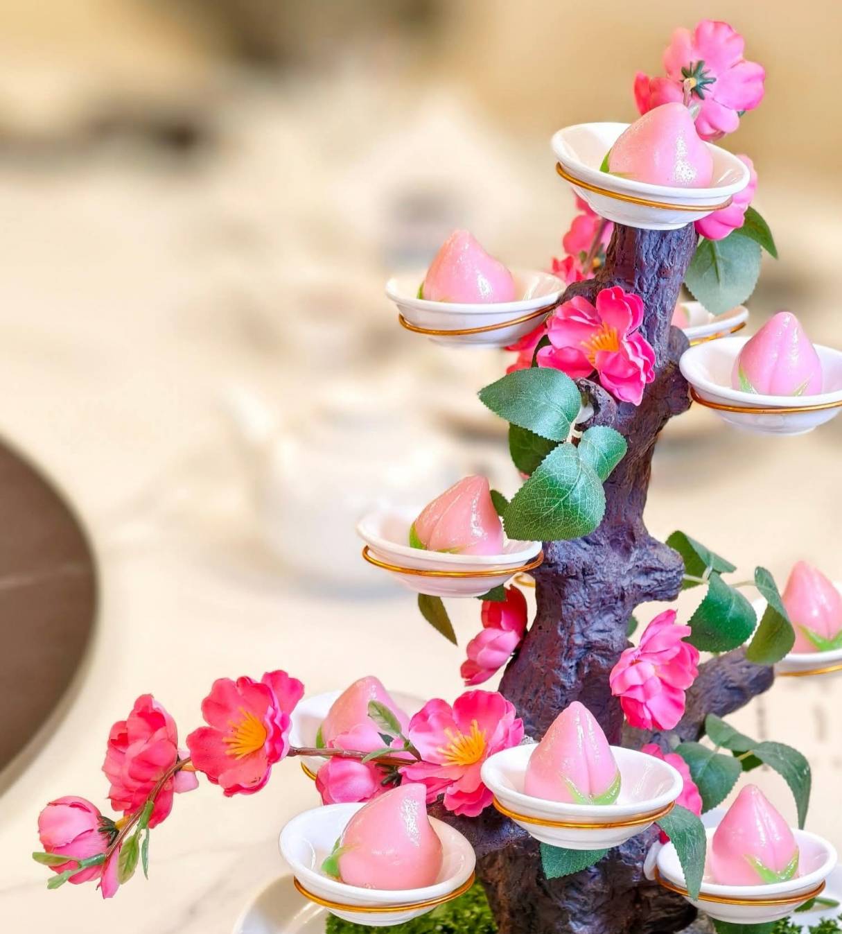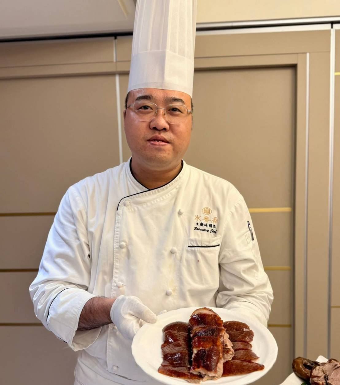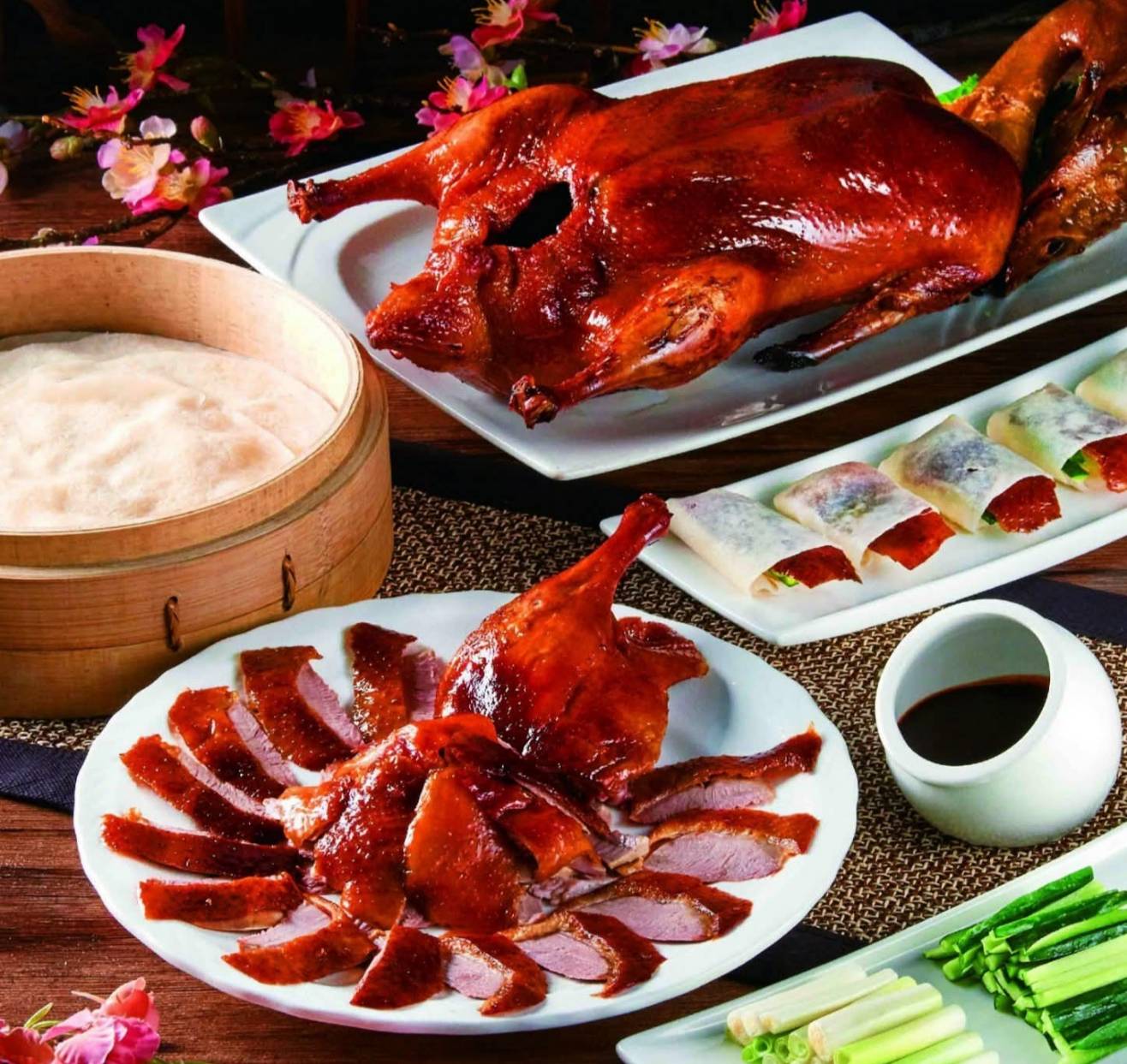 在宴會中,幾道招牌菜色尤為亮眼。首先「掛爐片皮鴨兩吃」選用約五至五點五斤的櫻桃鴨,師傅先將鴨皮細片,鴨皮酥脆、鴨肉鮮嫩,佐以荷葉餅、蔥段、小黃瓜及甜麵醬,展現經典粵味;轉而使用鴨肉第二吃如鴨鬆、生菜包或鴨粥,豐富選擇。