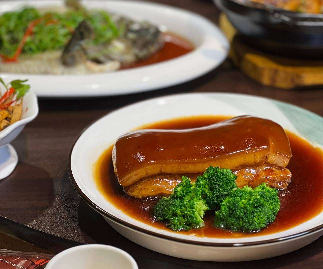 海鮮方面,「橙絲生抽蝦」採用大蝦炸至金黃酥脆,與橙汁、橙絲快炒,蝦肉彈牙並帶有清爽果香;「清蒸龍虎斑」則以新鮮石斑魚為主角,肉質細緻、醬汁甘醇,是海鮮饕客之選。