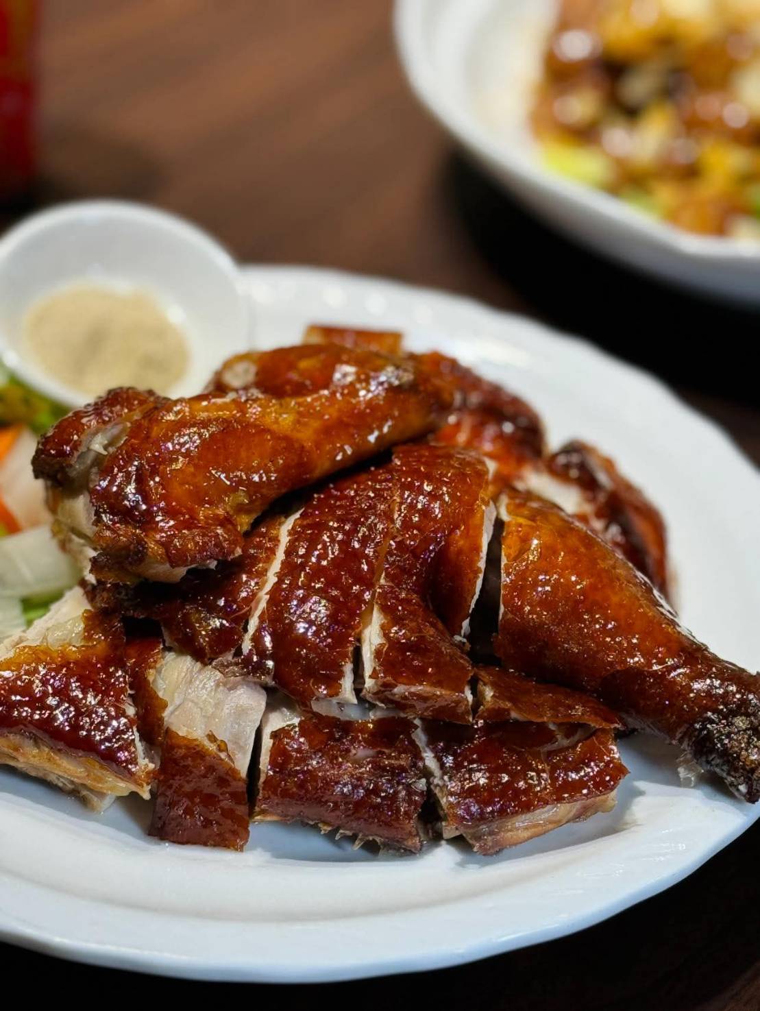其次,「老滷東坡肉(附刈包皮)」選用當日溫體黑毛豬五花長時間慢滷,外皮晶亮、膠質豐富,夾入刈包皮,讓人一口便能感受鹹香醇厚、肥而不膩的層次。再者「蒜香脆皮雞」為每日限量供應,雞皮紅潤酥脆、雞肉嫩香,適合開胃享用。