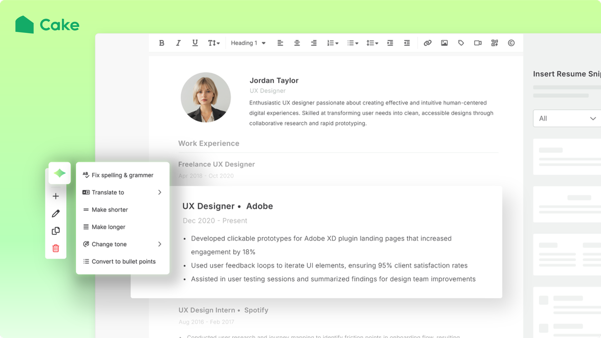 AI Resume Builder(履歷編輯器)支援文法修正、語氣調整、翻譯、段落重組等編修。