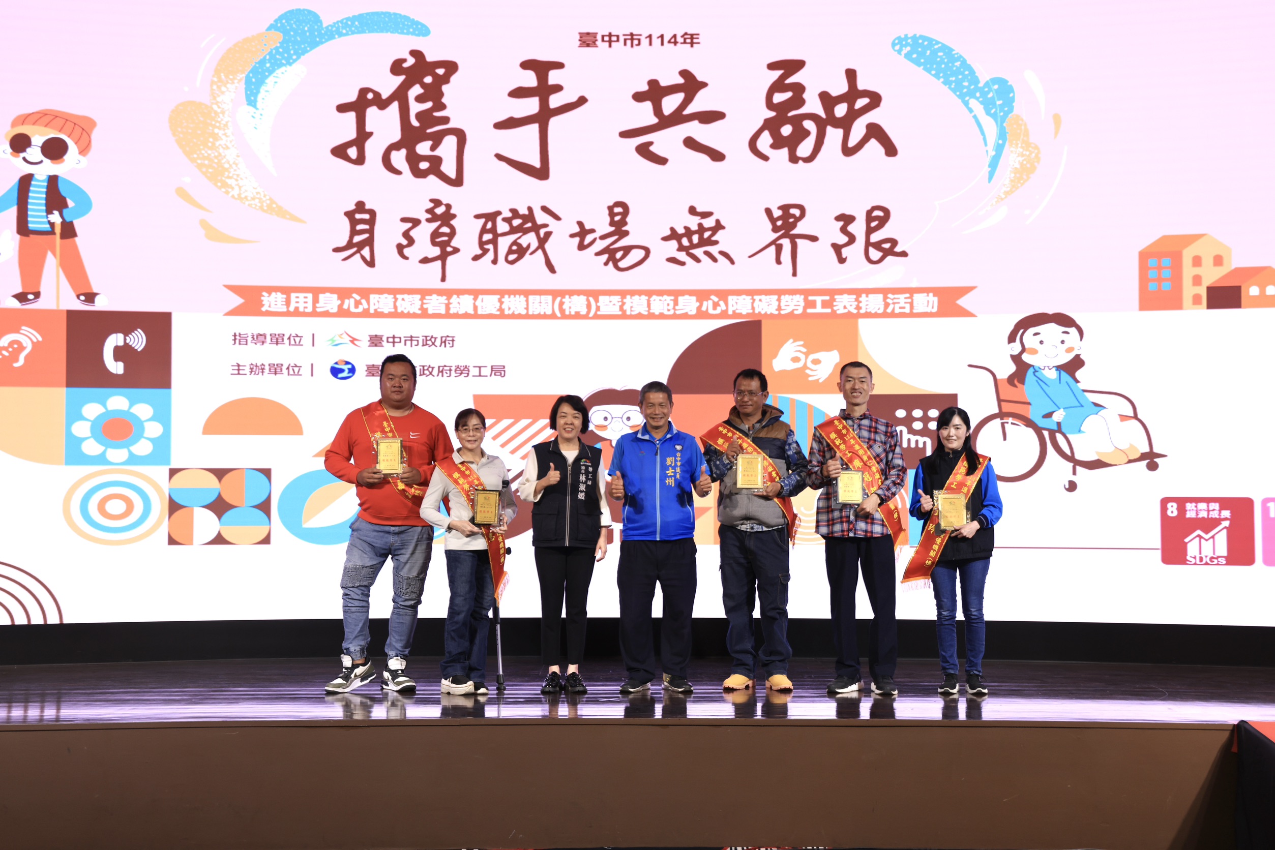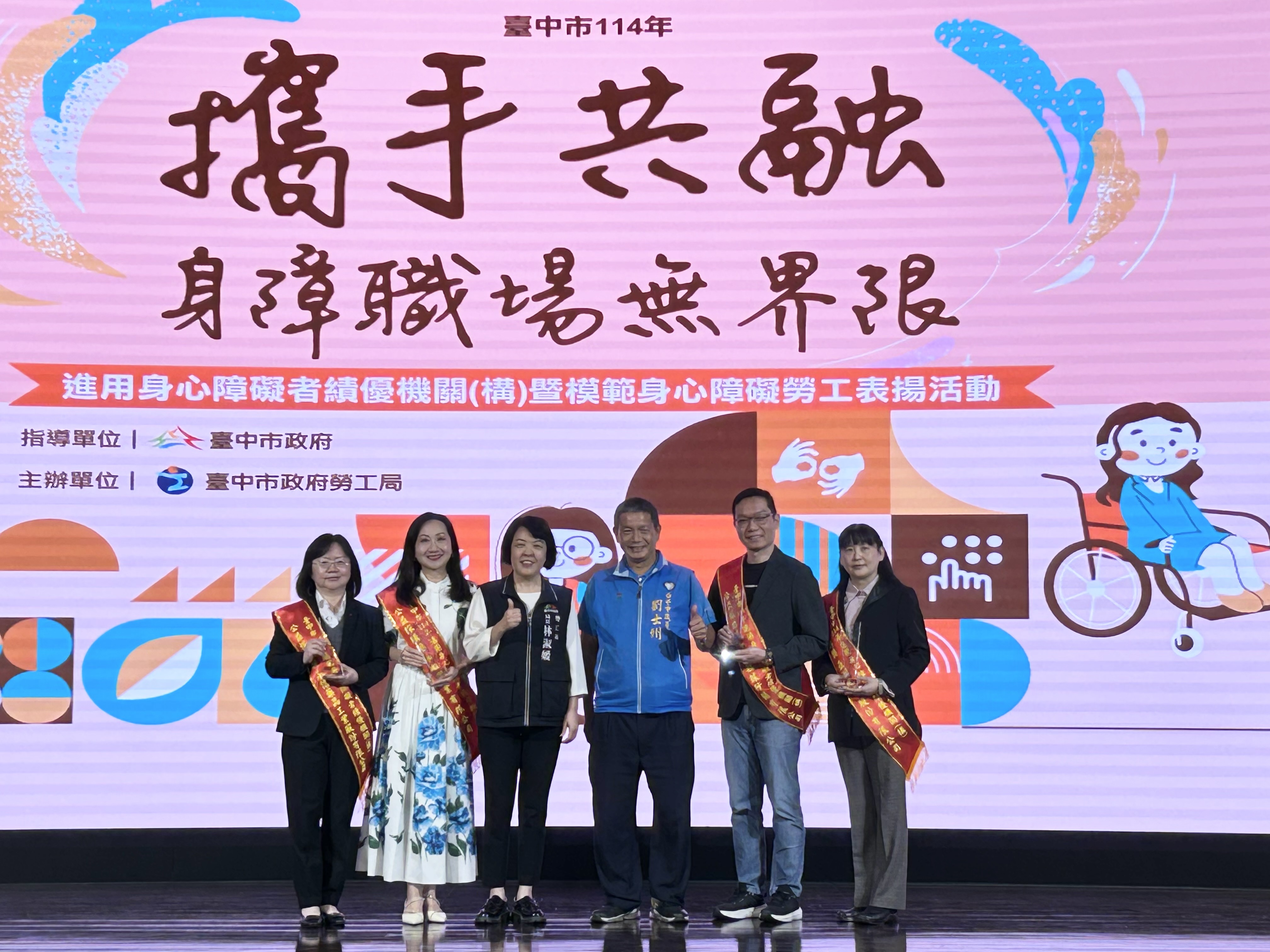 報新聞/中部特派員鄒志中報導 「限制不是終點,而是重新出發的起點…」為彰顯企業社會責任與身障者職場實力,打造尊重差異、接納多元、成就夢想的友善城市,並表揚共融職場的典範;臺中市政府勞工局2025年11月27日盛大舉辦「中市114年進用身心障礙者績優機關(構)暨模範身心障礙勞工表揚活動」。此舉旨在肯定積極推動職場共融的事業單位,並表揚身障朋友在工作崗位上的卓越表現與堅毅精神。現場共頒發包括楷模獎、優良事蹟獎、模範身心障礙勞工、公益採購獎,以及職場體驗友善廠商等五大類獎項,總計34個單位及個人獲得殊榮,場面溫馨感人,展現社會對就業平權的高度重視。