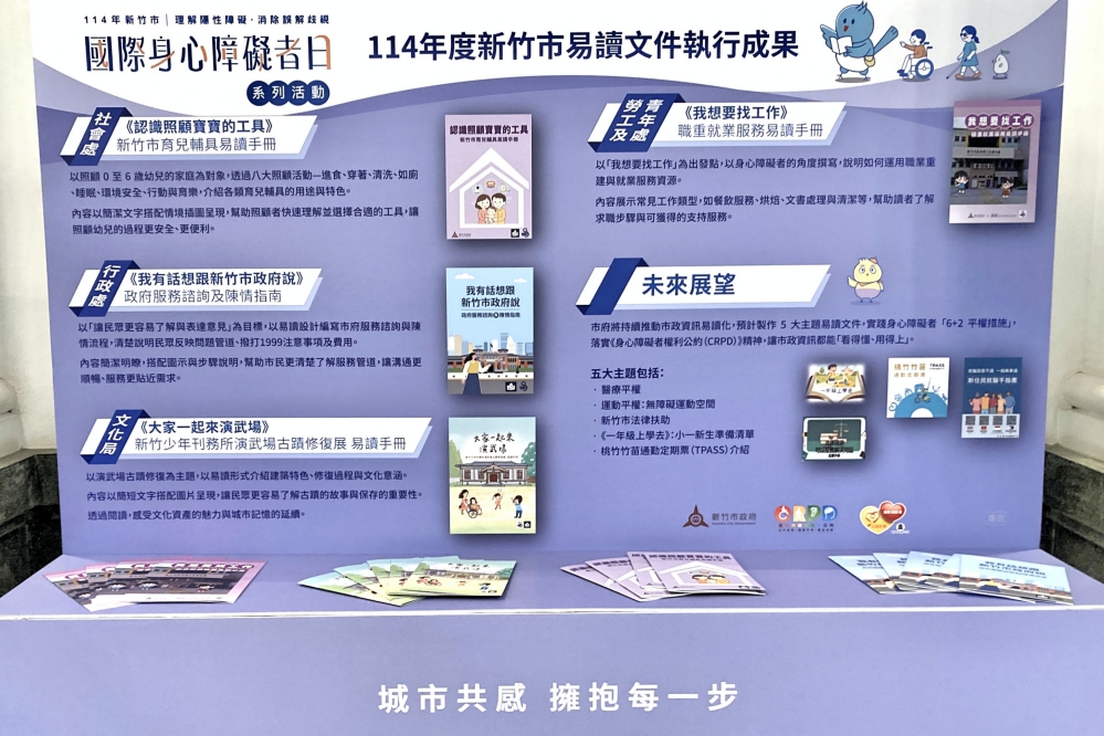 邱代理市長指出,此次同步發表由社會處、文化局、行政處、勞工及青年處製作「認識照顧寶寶的工具」、「大家一起來演武場」、「我有話想對新竹市政府說」、「我想要找工作」4大主題易讀文件,實踐身心障礙者權利公約平等參與精神,邀請市民朋友12月1日至12月7日前往將軍村,欣賞竹市身心障礙福利機構、團體的藝術作品與服務成果。
