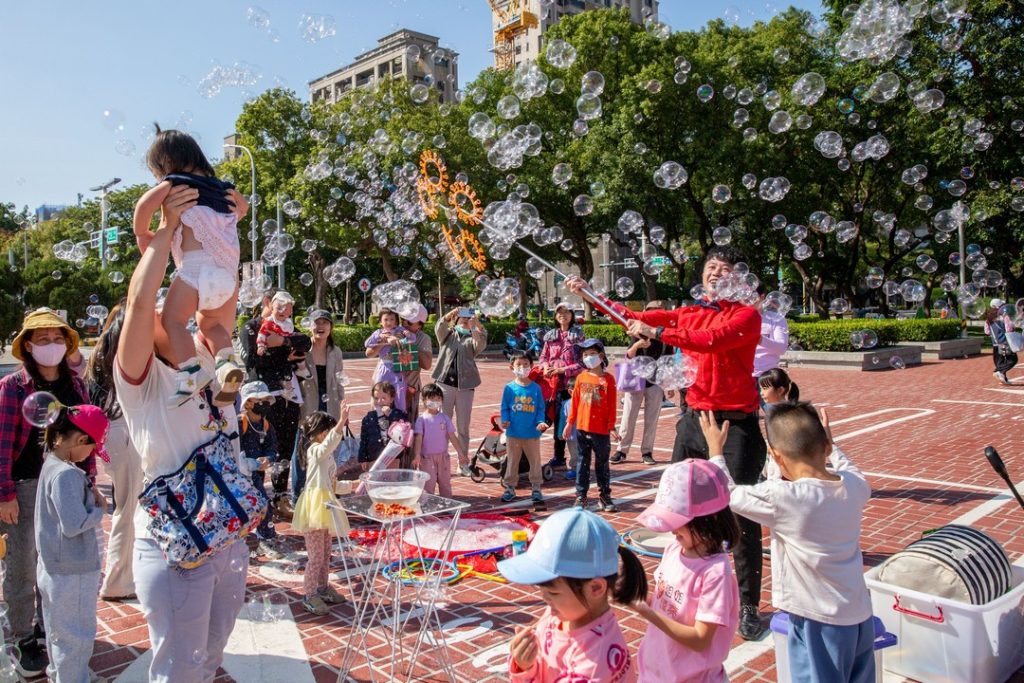 圖說: 親子在嘉年華會泡泡遊戲區開心同樂,現場洋溢繽紛歡笑。