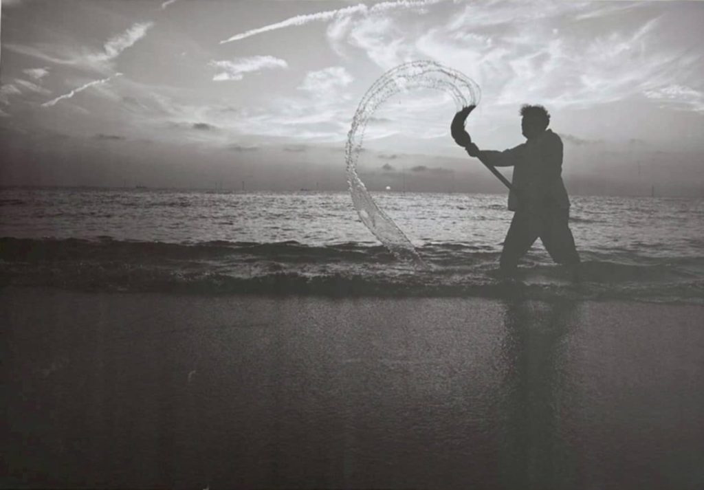 陳世憲在雲林的口湖海邊由沙灘走進海中,夕陽最後的寫照,把大海當作硯池,把天空當作畫布來書寫。(攝影/魏三峰)