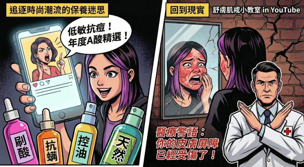 臨床上常見年輕人大量跟風,在尚未成熟的皮膚上,反覆疊加A醇、維他命C、高濃度酸類等重裝抗老成份,結果就是敏感肌的盛行率超過75%。許多民眾甚至誤以為使用後發癢、發紅才是有效的證明,殊不知這正是皮膚遭受化學性灼傷,面臨屏障崩解發出的求救信號。