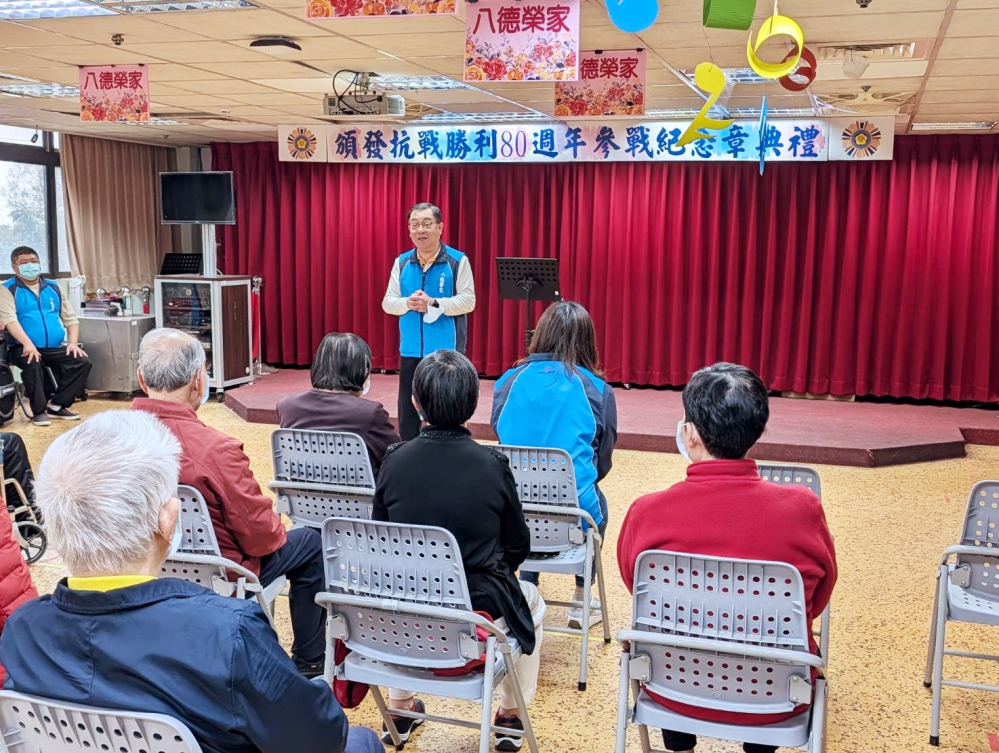 為表彰退伍袍澤於戰火中奮勇作戰、保家衛國的英勇事蹟,向長年奉獻國家的榮民長輩致上最高敬意,桃園市後備指揮部指揮官蘇國棟上校代表國防部,日前蒞臨八德榮譽國民之家,舉行「紀念抗戰勝利八十週年暨頒發抗戰參戰紀念章典禮」。