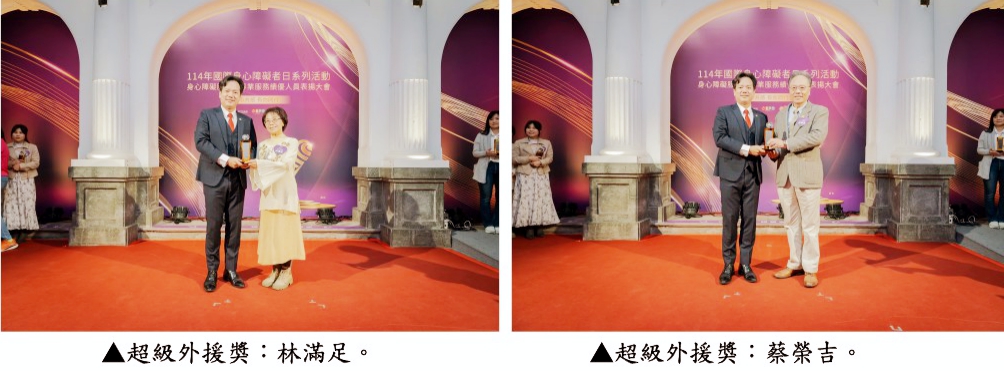 社會處指出,這屆獲頒「終身成就獎」的蔡梅麗女士,自民國70年投入身障服務領域,對提升身障者社區服務、促進就業、創新工作、社會參與、推動融合及平權,貢獻良多。44年來,她服務的熱誠與初心始終不變,陪伴許多家長走過照顧壓力與生命低谷。曾有案家動容表示:「梅麗像是一位活菩薩,不只救了我的孩子,也救了我。」蔡女士以自己的黃金歲月與心力,全心全意投入身心障礙者服務,榮獲「終身成就獎」可謂實至名歸。