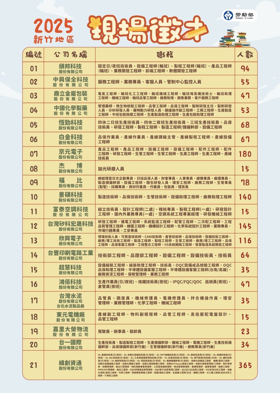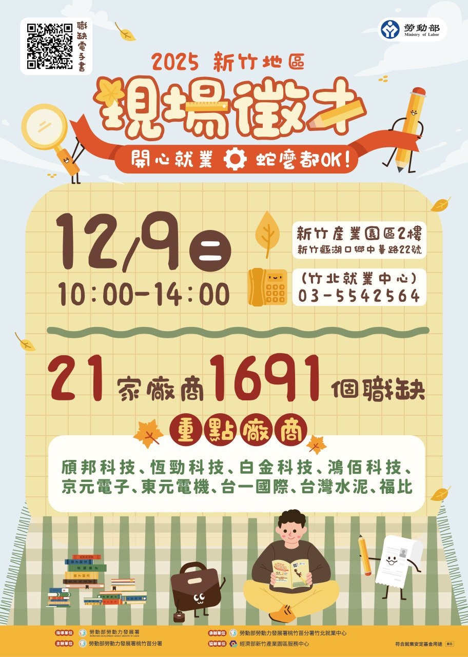 ▲桃竹苗分署竹北就業中心12/9日「2025年新竹地區現場徵才活動」集結21家優質企業、提供多達1,691個職缺。(圖/桃竹苗分署提供)