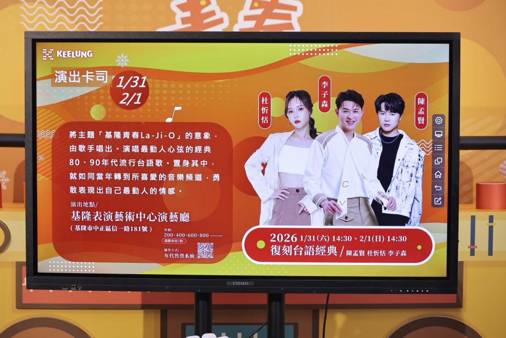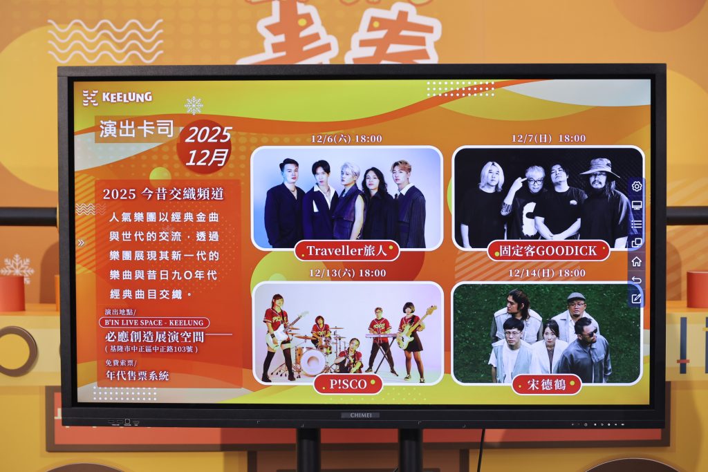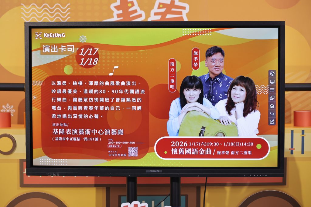 文化觀光局長江亭玫說明,系列活動將於 12 月 6 日在必應創造展演空間率先推出《今昔交織頻道》,邀請「Traveller 旅人」、「固定客 GOODICK」、「P!SCO」、「宋德鶴」等樂團演出,活動採免費索票方式,邀請市民踴躍參加。2026 年 1 月 17 日起,基隆表演藝術中心將接續推出《懷舊國語金曲》與《復刻台語經典》兩場售票音樂會,由施孝榮、南方二重唱、陳孟賢、杜忻恬、李子森等實力派唱將演出,設籍基隆的市民可享七折優惠,門票自今日晚上八時在年代售票系統開賣,邀請市民用行動支持藝文發展。