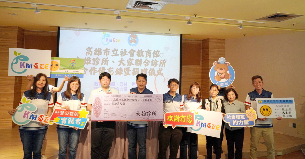 為感謝志工長期無怨無悔的付出,高雄市立社會教育館今12月5日(國際志工日)下午,在演講廳隆重舉辦「合作備忘錄簽署儀式」。由館長黃昭誌與大雄診所、大家聯合診所顏大鈞醫師共同簽署,象徵教育、醫療、社會公益,攜手合作,讓守護市民心靈、健康社會穩定的力量,匯聚交流,在高雄交織出幸福與關懷的光,讓愛轉動。