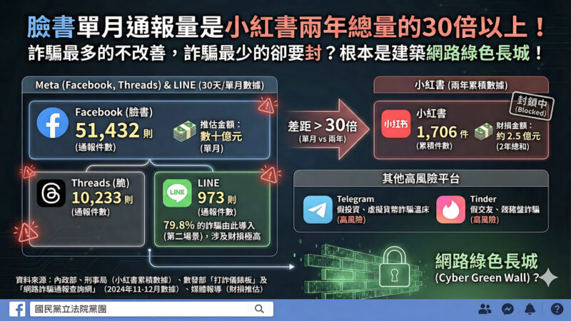 (報新聞/鄒志中 特稿)      內政部日前以「小紅書」在國安資安檢測中全數不合格,且涉及高達一千七百餘件詐騙案、財損近二點五億元為由,宣布將依《詐欺犯罪危害防制條例》的「緊急事件」規定,對該應用程式執行為期一年的「停止解析及限制接取」命令,影響台灣超過300萬名用戶。國民黨立法院黨團立即召開 “封殺小紅書 假反詐真鎖國” 記者會抨擊,賴政府要學對岸鎖國作法?在台灣廣蓋「綠色數位長城」?要求政府立刻撤回封鎖命令。
