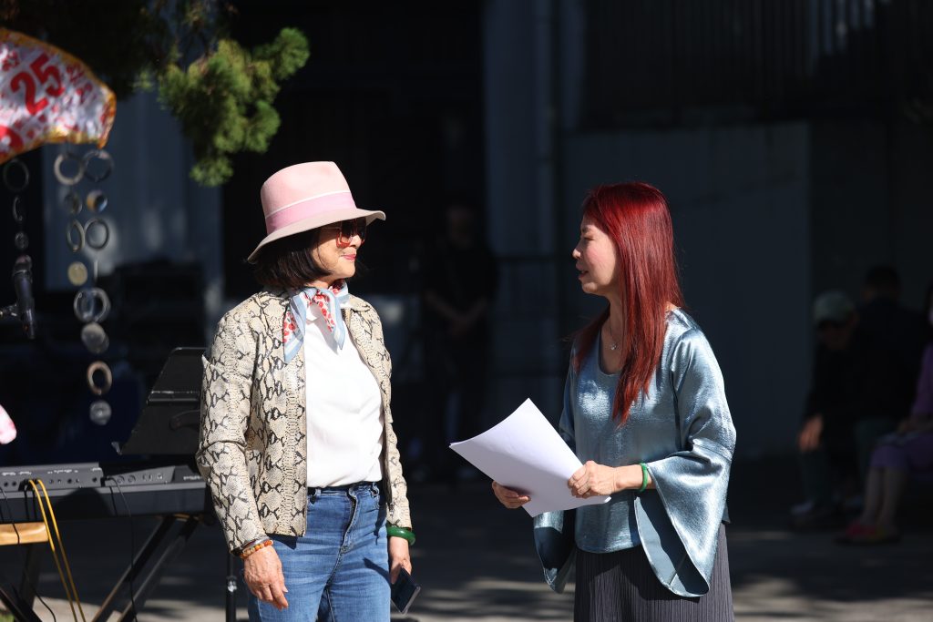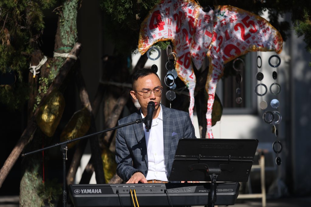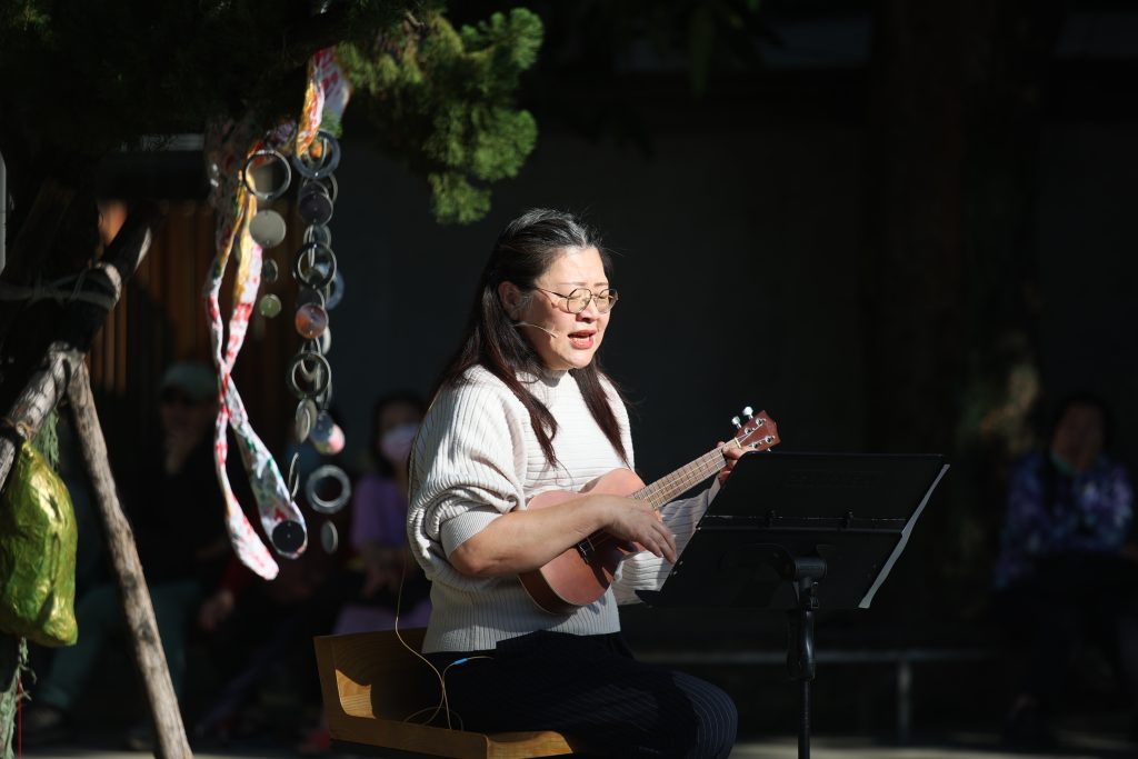 沉重之後又是如歌的行板,邱婉容為受難者捧起一陣溫暖的風。她朗誦〈記憶的風〉時,聲音柔美而高亢,從容而堅定,將白色恐怖受難者的生命故事重新點亮。不僅如此,她還特別為詩編曲,以烏克麗麗伴奏,優美的歌聲迴盪園區,自在如穿雲之姿。她說:「那些消失的名字、未寄出的信、遺留在土地上的愛,都值得被再次聆聽,從黑暗走向光明的歷程。它不是控訴,而是一種溫暖的紀念。」