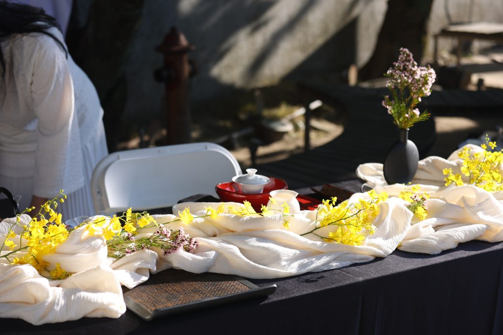 本次活動結合彭博功夫茶與武術表演,呼應生活中的品味與養生,與身心流動的自由。五席功夫茶席自活動開始便未曾間斷,茶香像一條溫暖的河流,帶著觀眾從過去走到當下。五位茶師彭博、薛麗君、陳美蘭、汪嘉偉、葉純妤,設置的五個茶席各有特色,茶師們是生活美學的實踐者,從妝髮服飾、茶席擺設、杯壺造型、到舉手投足,都是功夫,都令人沉浸於茶湯之中而目不轉睛,茶香在空氣裡緩緩散開,觀眾的情緒因此被輕輕安放。