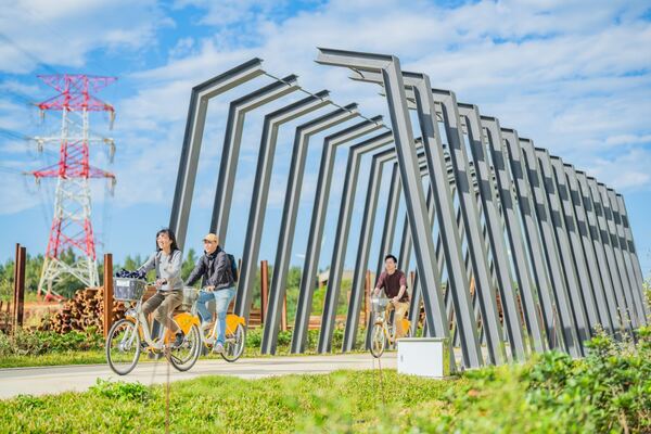 都市發展局表示,臺鐵林口線路廊活化第五期工程,施作長度約1公里、改善面積約1.8公頃,完成虎頭山至蘆竹海邊的自行車道串連,除改善交通安全外,也結合舊運煤鐵道特色,設置活動廣場、近水花園及光影廊道,並完善YouBike、簡易維修站及廁所等公共設施,並保留農機引道,以兼顧周邊農地耕作需求。