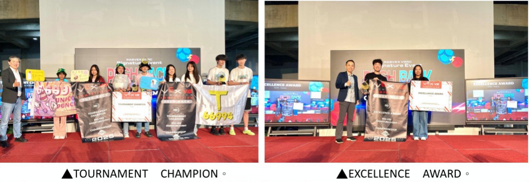 在歷時三天的賽事中,參賽隊伍經歷了層層淘汰賽與最終的總決賽,活動邀請企業領袖與教授裁判頒獎,表彰參賽者的傑出表現。最終頒發十四個獎項,包括萬眾矚目的Tournament Champions和 Excellence Award。這兩項大獎的得主將直通 2026 VEX 世界冠軍錦標賽,於美國達拉斯的世界冠軍賽中角逐更高榮譽。這些獎項不僅象徵著參賽隊伍的技術實力,更是對他們在創新設計、工程技術與團隊協作能力的高度肯定。
