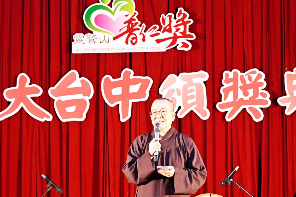 台中講堂監院妙明法師說,今天是冬至也是天赦日,80年才一次,今天的能量非常強大,在這樣的日子行善,更能匯聚加倍的正向力量。他也感謝在座貴賓認同支持普仁獎理念,讓這份善能夠持續傳遞。他也說,教育不只是知識的傳授,更是生命影響生命的過程。普仁獎傳遞普遍仁慈的精神,將五德:正面、積極、樂觀、愛心、願力,化為孩子心中長久的善種子,成為未來前行的力量,也祝福獲獎的小太陽帶著普仁獎的期許勇敢追夢。