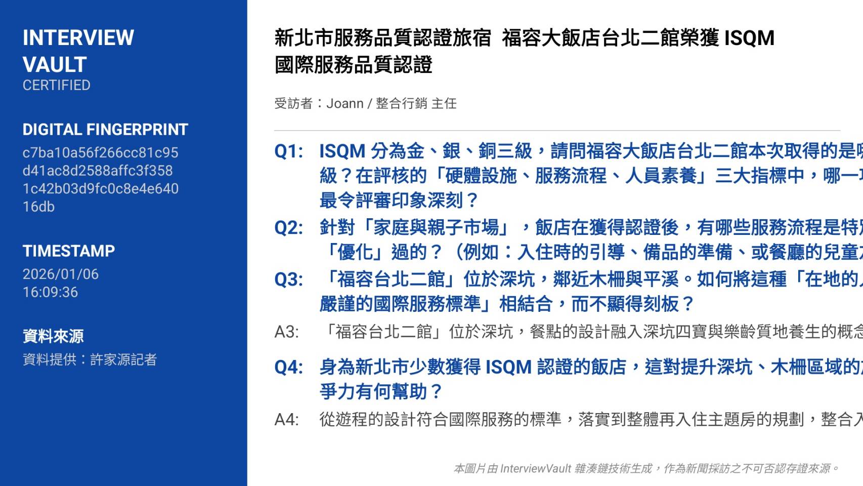 「在飯店業,提供一次好的服務並不困難,真正的挑戰在於長期維持穩定水準。」福容台北二館表示,本次評核過程中特別著重服務流程的穩定度與第一線應變能力,透過完善的 SOP 與主動關懷機制,確保旅客在不同時段、不同需求情境下,皆能獲得即時且適切的服務回應。這份認證,正是對飯店服務一致性與細膩度的肯定。