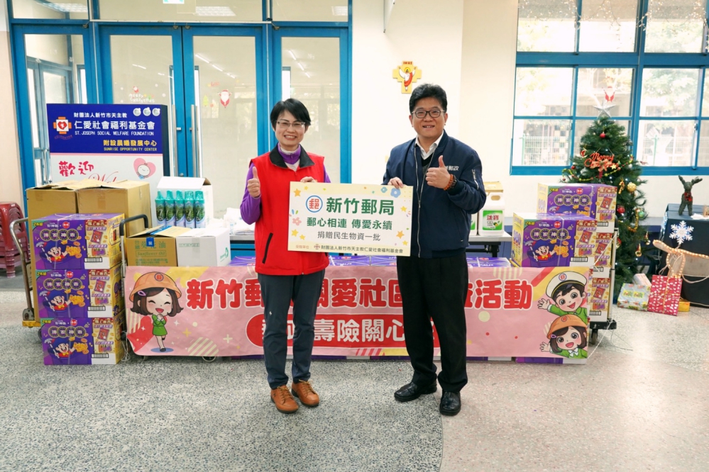 ▲新竹郵局「郵心相連.傳愛永續」關愛社區公益活動,新竹郵局局長吳進益(右)代表捐贈民生物資送暖仁愛社會福利基金會長者。(圖/新竹郵局提供)