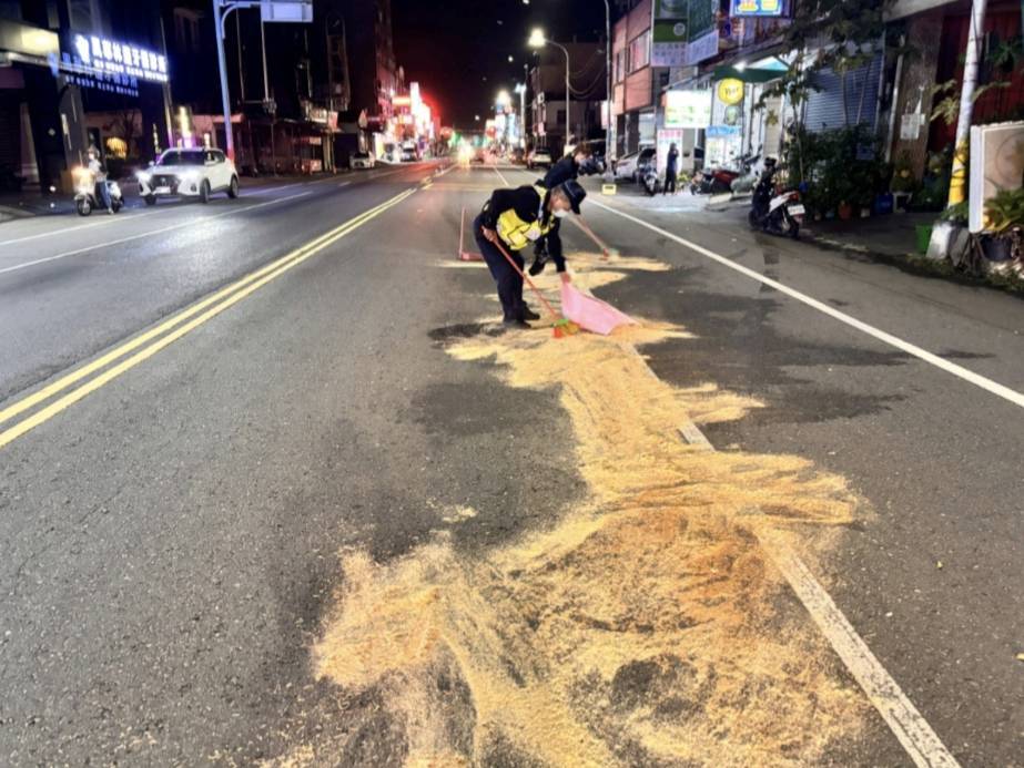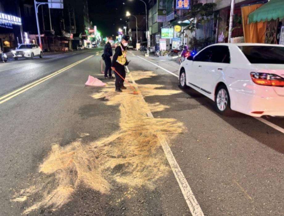 【記者 彭可可/綜合報導】日前,東港警分局林邊分駐所副所長蘇順元、警員張汝婷、王薏瑄,在晚間19時赴林邊鄉臺17線處理一宗交通事故。事故現場因事故車輛大量滲漏機油,警方迅速展開清除工作,防止油漬造成後續交通事故,並獲得民眾的讚賞。