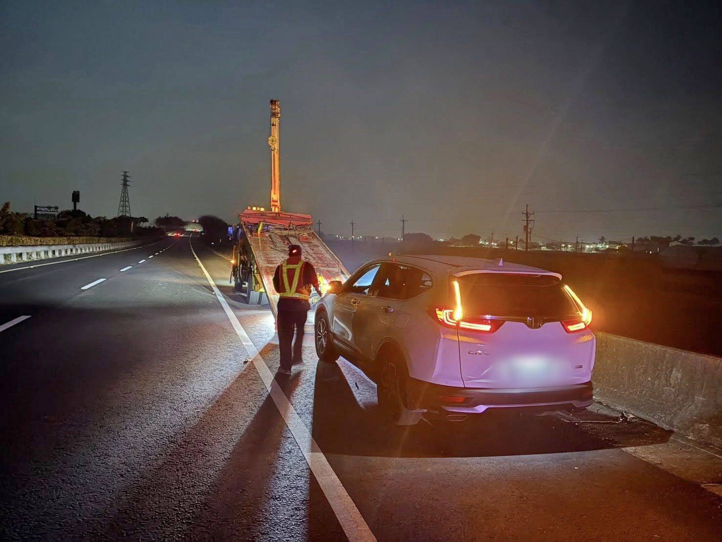 駕駛看到警察到來立即揮手求救:「警察先生,我的車爆胎了,無法行駛,你可以幫幫我嗎?」當時天色昏暗視線不佳,行車速度又相當快,員警擔心故障車輛影響交通安全,立即於現場警戒,疏導其他車輛往內側車道行駛。