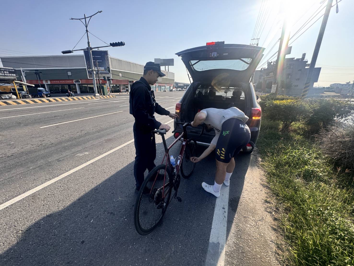 經警方了解,得知美籍男子打算騎乘自行車前往台南,卻在行經嘉義縣水上鄉台一線公路時,因事故導致自行車損壞無法騎乘,由於身處異國,人生地不熟,一時之間不知如何求援,只能牽著自行車沿途步行。所幸遇到熱心的員警,顏員立即將其載返回派出所休息,提供熱茶安撫其疲憊與焦慮,洪員協助檢查自行