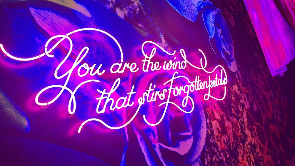 終場,站在近兩千條串接著愛心、蝴蝶、眼睛與花朵的霓虹水晶簾幕中,原本會凋謝的花,被轉化為一種跨越現實的幻境。似乎也在叩問:如果美麗可以透過科技與藝術永存,那麼從繁花似錦中被抽離出來的「凋零」,是否才是最接近生命本質的時刻?