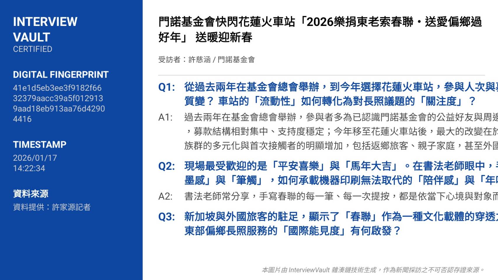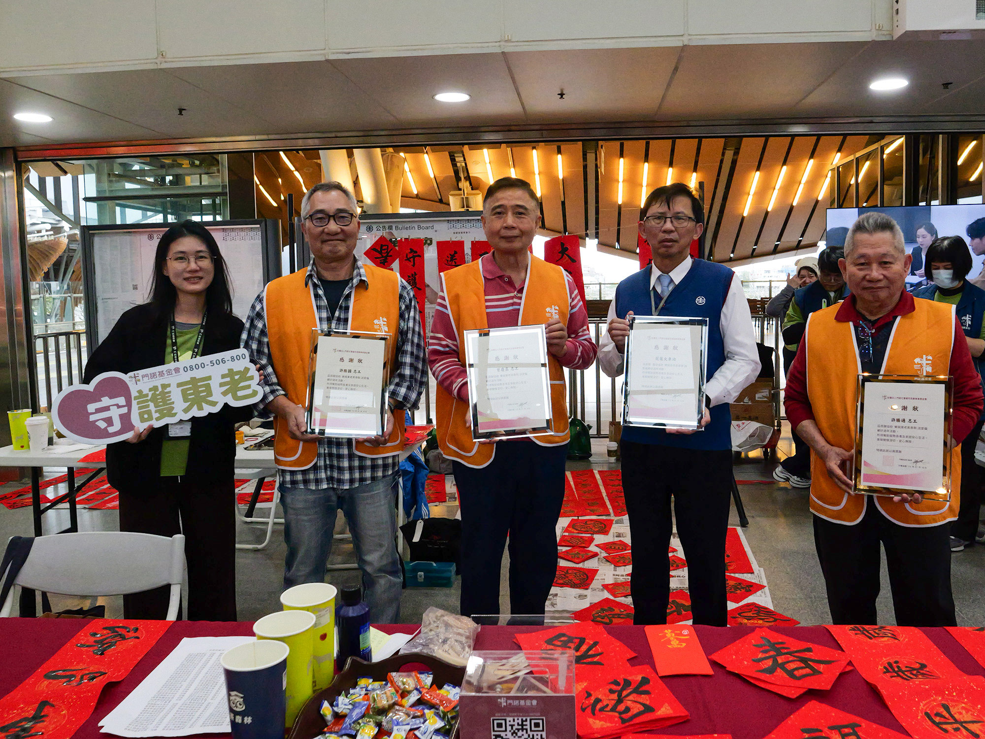 門諾基金會表示,「樂捐東老索春聯」自2024年起連續舉辦,過去兩年多在基金會總會內舉行,今年首度走進花蓮火車站,正是看見公共場域的流動性與擴散力。在返鄉、旅遊與日常通勤交錯的場景中,公益不再是特定族群的行動,而成為旅途中自然相遇的一部分。活動現場由書法志工曾慶熹、許勝國、許勝通三位老師揮毫,讓民眾依喜好索取春聯,也同步設置長照服務宣導攤位,介紹花東偏鄉長照服務與長照3.0資訊,深化社會大眾對長照議題的理解。