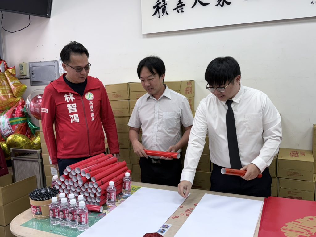 高雄市議員林智鴻今(18)與全國200處據點,同步響應中華職棒會長、立委蔡其昌發起「台灣尚勇」春聯發送行動,吸引許多民眾一早便在他服務處前大排長龍,20分鐘內便將春聯全數掃光。現場除林智鴻親自發送外,更有長相激似蔡其昌以及總統賴清德的志工協助發放,令現場民眾一度以為是「本尊」親臨現場,差點要喊「總統好、會長好!」,直呼「怎麼那麼像」!