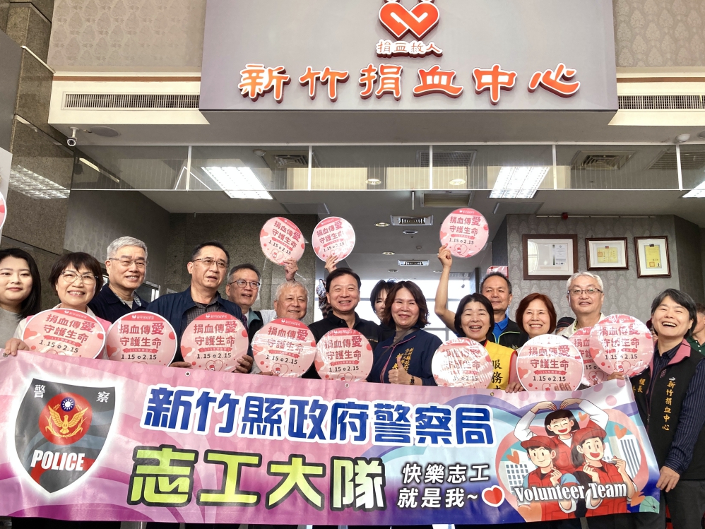 ▲新竹捐血中心聯手新竹縣警察局志工大隊1月18日舉辦 「捐血傳愛,守護生命!」捐血活動,一同在竹北愛心樓盛大揭開「捐血月」序幕,期盼以最熱血的行動凝聚最溫暖的力量。
