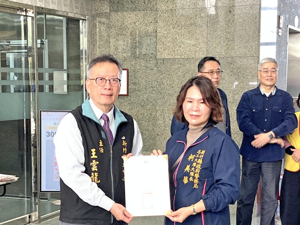 ▲新竹捐血中心聯手新竹縣警察局志工大隊1月18日舉辦 「捐血傳愛,守護生命!」捐血活動,新竹捐血中心主任王雲龍(左)致贈感謝狀予豐田義警分隊。