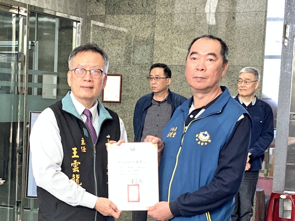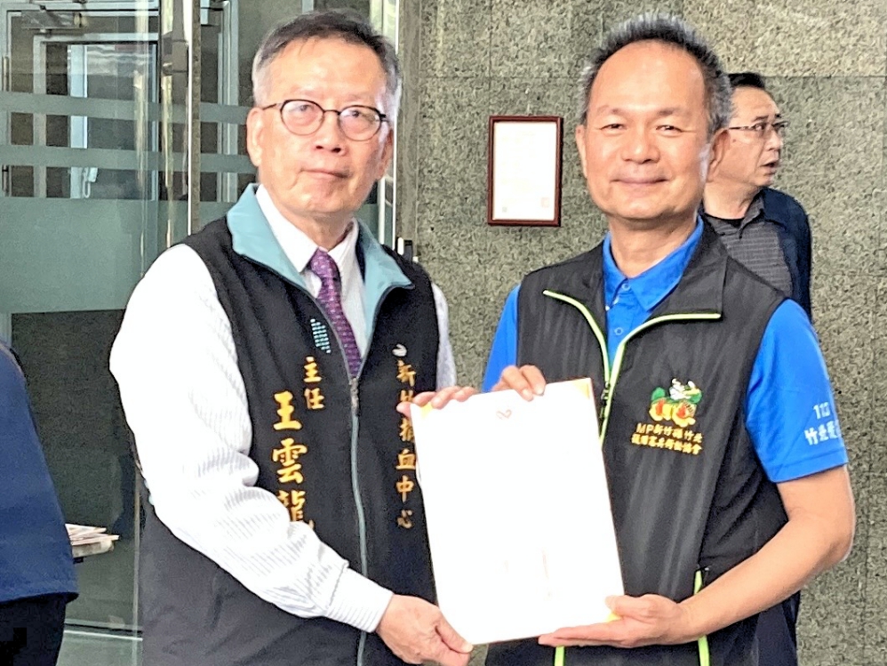▲新竹捐血中心聯手新竹縣警察局志工大隊1月18日舉辦 「捐血傳愛,守護生命!」捐血活動,新竹捐血中心主任王雲龍(左)致贈感謝狀予豐雅國際同濟會。
