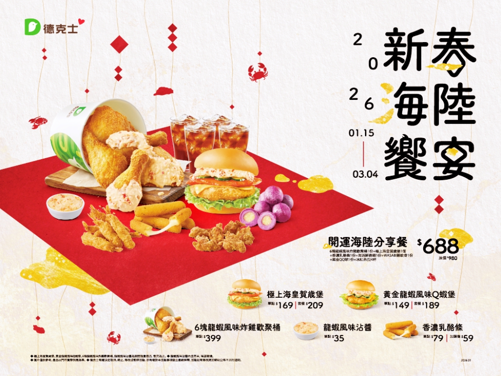 德克士表示,新春海陸系列商品即日起於全台門市限時販售,「開運海陸分享餐」整合漢堡、炸雞與點心內容,提供消費者在忙碌的年前與春節假期,一個兼顧便利與品質的外食選擇。