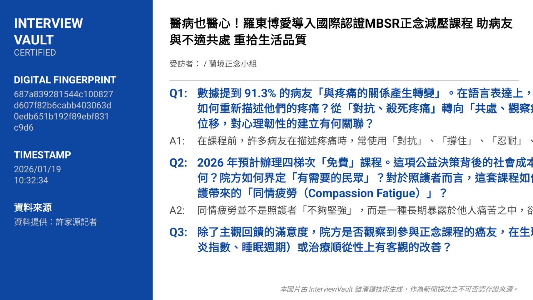 羅東博愛醫院從109年開始引進國際認證的MBSR正念減壓課程,至今已陪伴醫護與病友走過六年多時光。起初針對高壓的醫療團隊,幫助大家在繁忙與情緒負荷中找回內在平靜;後來擴大到癌症病友、慢性疼痛患者,以及長期受焦慮失眠困擾的民眾。透過八週的引導式練習,參與者學會把注意力從「一定要消滅疼痛」轉移到「觀察與接納當下」,許多人形容這就像給緊繃的心多了一扇窗。