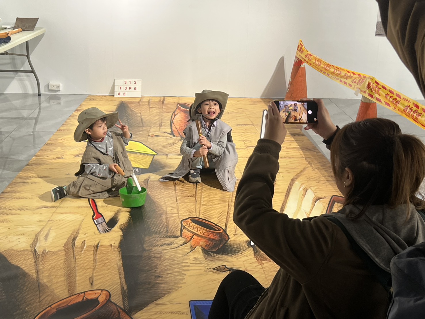 步入展場,視覺隨即被地面的超擬真「3D 考古發掘探坑地貼」所吸,彷彿瞬間從現代商場跌入千年前的歷史現場,泥土的紋理與埋藏的古物栩栩如生,帶來強烈的視覺衝擊。這是園區回應 108 課綱中「自主學習」與「在地文化」素養的具體實踐,透過精心打造的「沉浸式扮裝互動區」,邀請大小朋友換上裝備,化身「一日考古學家」。不同於傳統博物館的靜態陳列,這裡強調「手作」與「感知」,孩子們在陶罐拼圖的互動中,模擬文物修復的細膩過程,指尖觸碰的不只是碎片,更是對歷史記憶的實質修復。這種寓教於樂的設計,成功將生硬的考古知識轉化為可被理解的日常實踐故事,讓家庭遊客在春節寒假期間,能以最輕鬆的姿態,近距離觸摸淡水河左岸與右岸交織的文化脈絡。